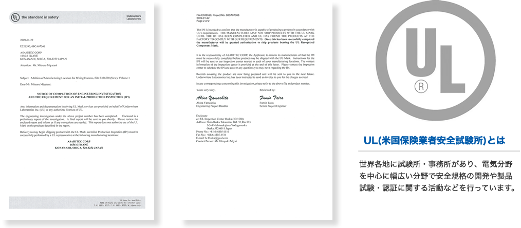 安全性に関する歴史ある規格「UL規格」。特に米国では、電気製品の安全性の象徴として受け入れられています。当社では、このUL規格に合致した難燃性の高いハーネスの製造が可能です。(認証番号:E326590, 08CA67366)